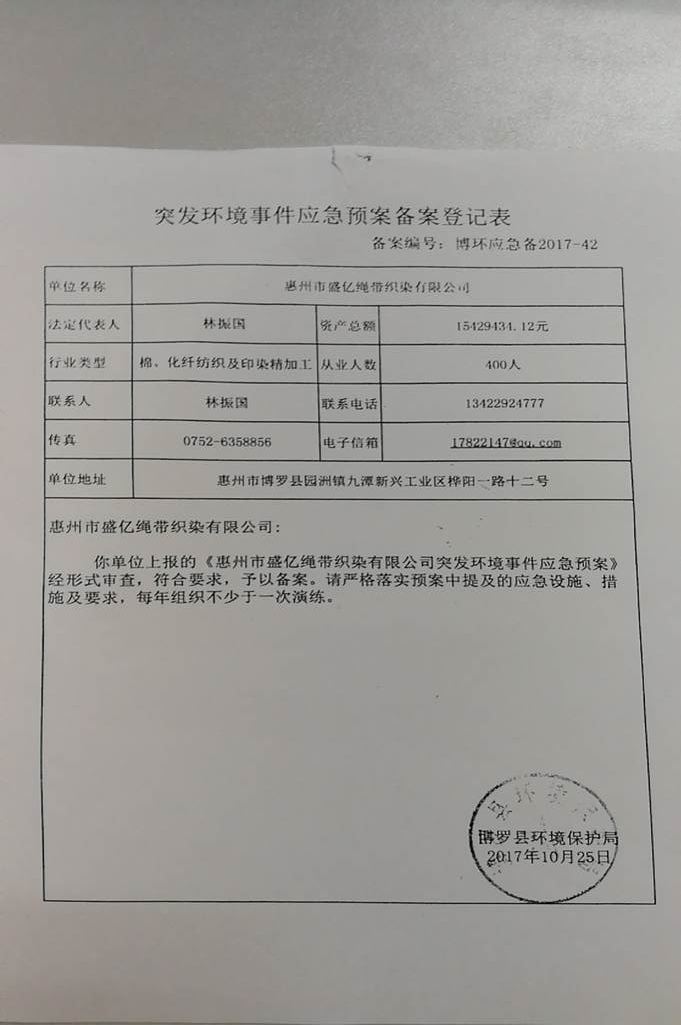 已制訂《惠州市盛億繩帶織染有限公司突發(fā)環(huán)境事件應(yīng)急預(yù)案》,并于2021年 5月24日在博羅縣環(huán)境保護(hù)局備案,備案編號(hào):4413-2021-107-M